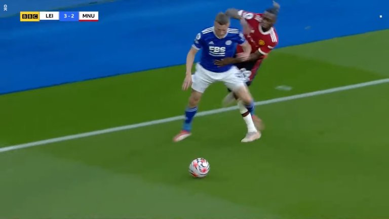 Бисака се забави с изчистването на една топка, като имаше и няколко други опции да подаде на свои съотборници, но позволи да бъде изпреварен от Варди, след което и го фаулира. Това се случва в 91-вата минута при резултат 3:2 за Лестър, но капитанът на "лисиците", за разлика от този на Юнайтед, ври и кипи от енергия и се бори за абсолютно всяка една топка.