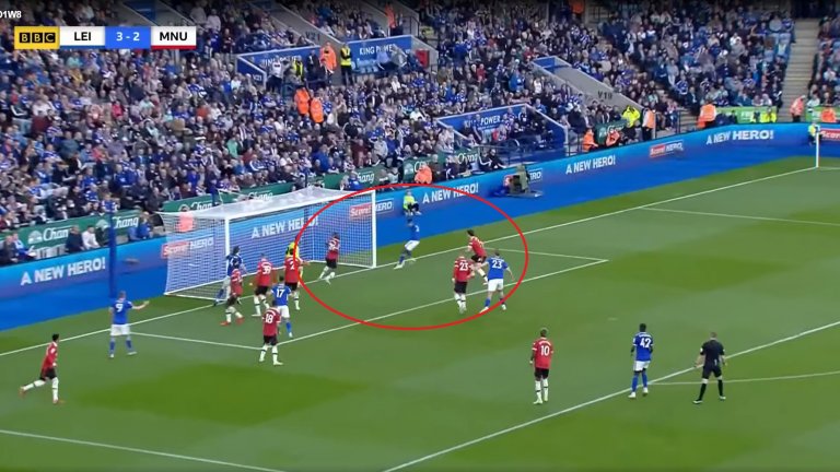 Така стигаме и до грешката на Магуайър. Преди центрирането капитанът е в близост до Джейми Варди, докато Линдельоф е готов да осигури подкрепа при спирането на Перес. В далечния край на екрана пък Люк Шоу се грижи за Дака. Секунда-две по-късно обаче Магуайър забравя за Варди и се озовава док Линдельоф и Шоу, докато нападателят на Лестър остава абсолютно сам и напълно необезпокояван праща топката в мрежата на Де Хеа за трети път.