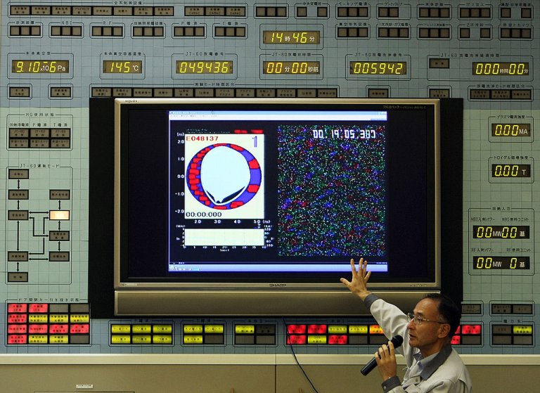 Термоядреният синтез е съвсем различен процес от деленето на атомите - техниката, която се използва в стандартните атомни електроцентрали. Реакторът в Ибараки е с височината на шестетажна сграда и представлява съд с цилиндрична форма, в която се завърта ядрената плазма.