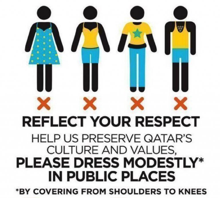 "Покажете уважение. Молим ви, помогнете да опазим културата и ценностите на Катар. Молим ви, обличайте се подобаващо* на публични места