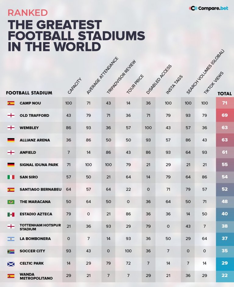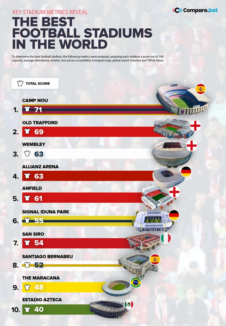 "Разположен в Барселона, "Камп Ноу" оглавява нашата класация на най-добрите стадиони в света с впечатляващ резултат 71 точки от общо 100. Съоръжението е с най-големият капацитет от топ 15 (99 354 места), което означава, че легиони фенове могат да гледат любимците си. "Камп Ноу" е също така много популярен и в социалните мрежи, като нашето проучване установи, че стадионът има 1 940 929 тагвания в Instagram и 184 400 000 показвания на хаштагове в TikTok - най-високите показатели от всички конкуренти.
