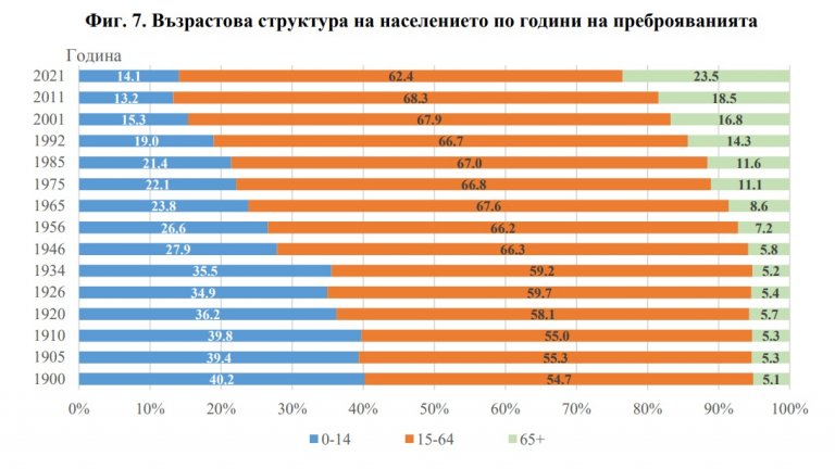 Очаквано, продължават изключително негативните тенденции по отношение на възрастовата структура на населението - все по-голямо увеличаване и на абсолютния брой, и на относителния дял на населението на възраст на и над 65 години, и намаляване на броя на хората в останалите групи.