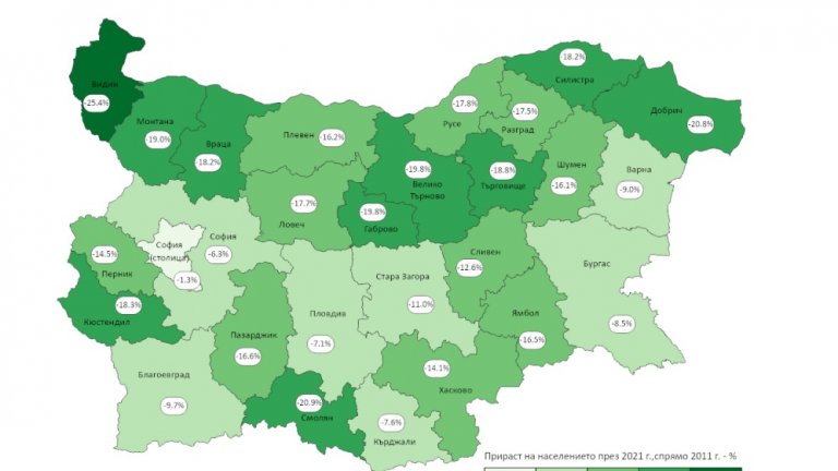 Резултатите на НСИ показват, че за последните 10 г. средногодишният темп на намаление на година се увеличава от 0.7 през периода 2001 - 2011 г. на 1.2 за периода 2011 - 2021 година.