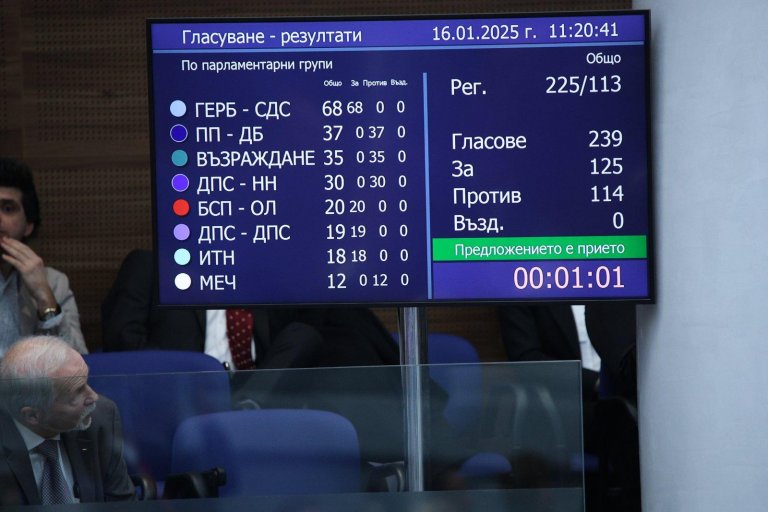 В подкрепа на Желязков за министър-председател гласуваха 125 депутати. "Против" бяха 114. Нямаше въздържали се. За структурата и състава на Министерския съвет вотът се разпредели по същия начин.