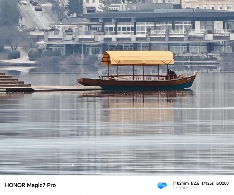 Лично се убедих в това, заснемайки тази отдалечена лодка в средата на езерото Блед при зуум над 40x.
