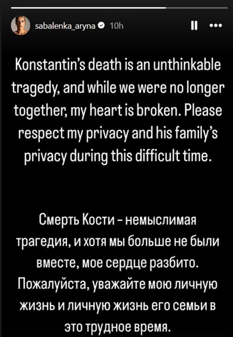"Смъртта на Константин е немислима трагедия. Въпреки че вече не бяхме заедно, сърцето ми е разбито - пише Сабаленка в публикация в Instagram. - Моля ви да уважавате личното ми пространство и това на семейството му."