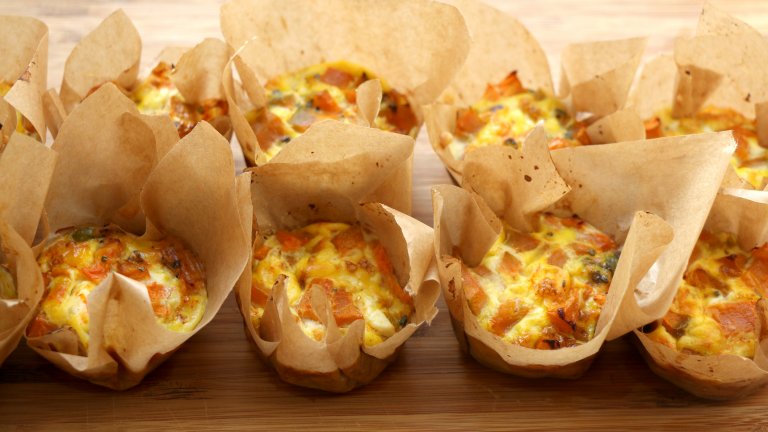 За да станат мини фритати използвайте форма за печене на мъфини. Можете да намаслите със зехтин директно всяка от формичките, но може да ползвате и хартиени подложки за тях.