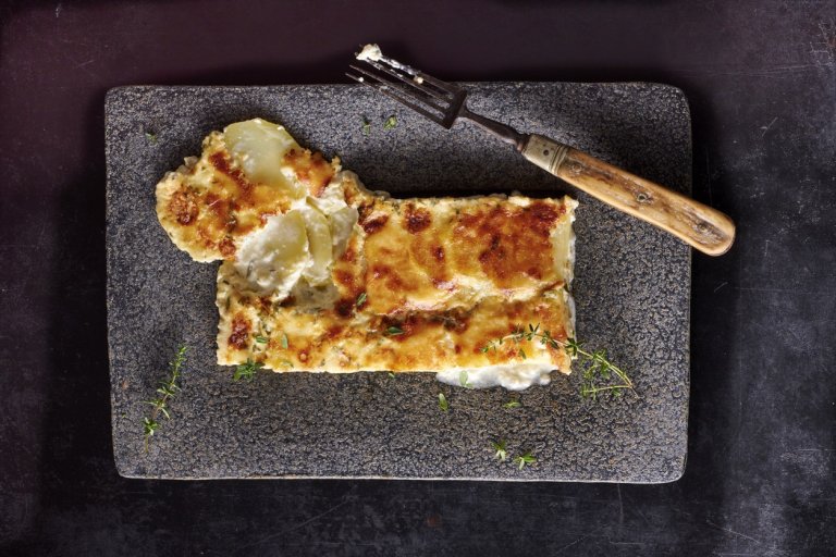 Фино френско ястие с картофи и много сметана. За него един килограм картофи се режат наистина на много тънко - не повече от 3 милиметра. Става лесно с ренде тип "мандолина" или с кухненски робот.