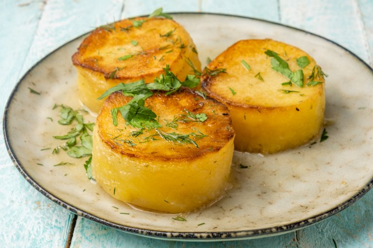 Режат се краищата на 3-4 големи картофа и от тях се оформят сравнително равномерни "пънчета" от по около 3 сантиметра. В тиган се сипва лъжица олио и лъжица масло и картофите се запичат от плоските страни, като през това време се подправят със сол и пипер.