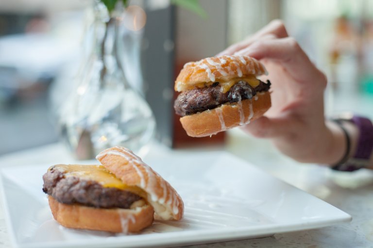 Калориите тук гонят безкрайност, защото поничките са доста тежка храна, гарнирани са с плътна захарна глазура, а като капак вътре са натъпкани продуктите за един не особено скромен хамбургер.