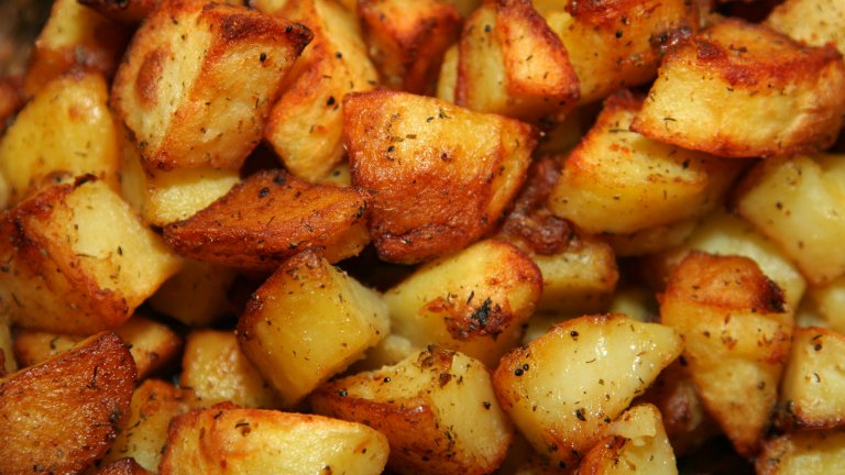 Тайната на идеалните печени картофи е, че първо трябва да се сварят. Обелете, нарежете на не прекалено малки кубчета около килограм картофи и ги сварете в подсолена вода. Свалете от огъна, когато са почти готови.