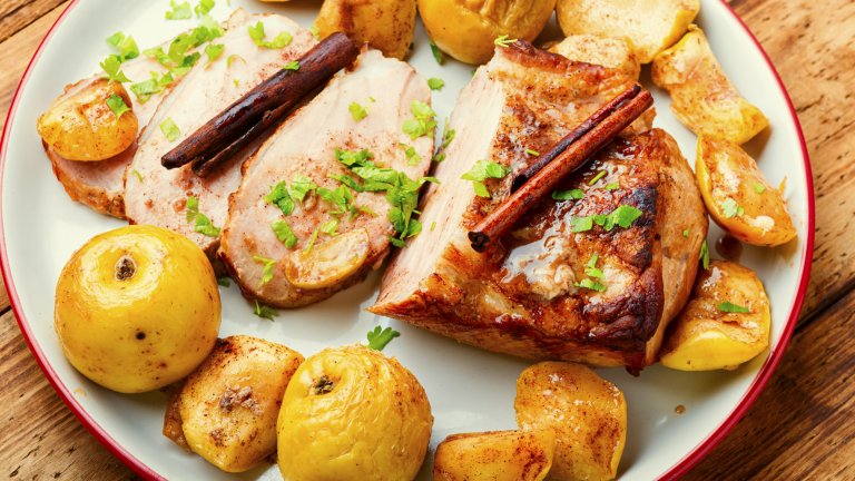 Захлупете с капак и печете за около половин час на 200 градуса. След това намалете топлината до 160 градуса и оставете ястието за около 3-4 часа - докато свинското омекне достатъчно. Накрая усилете температурата до 200 градуса и махнете капака, за да се получи коричка.