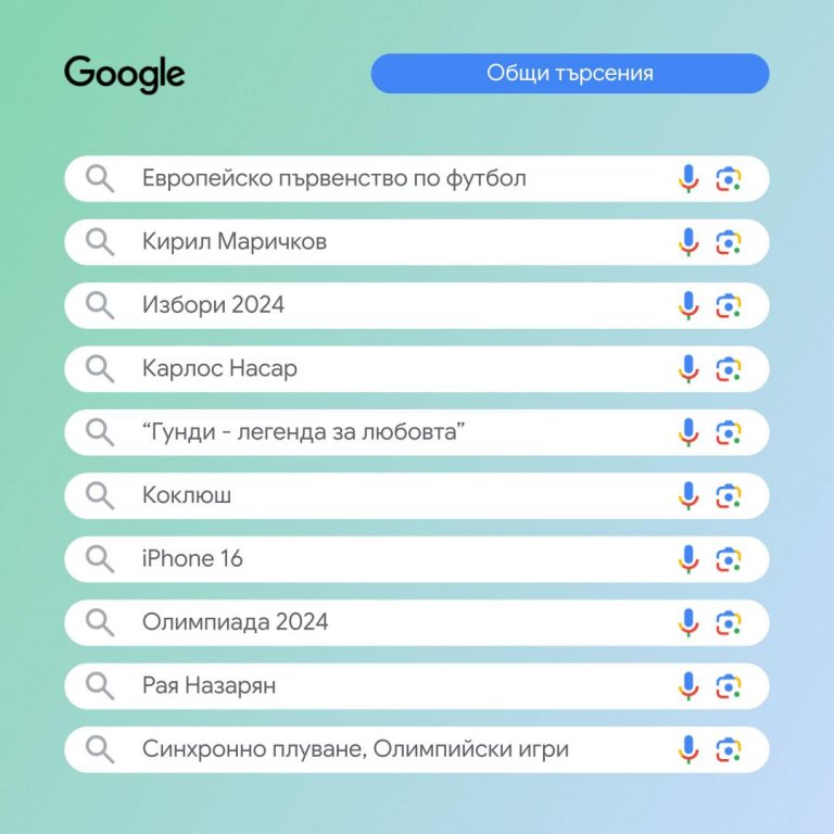 Челната десетка се попълва още от "Коклюш", "iPhone 17", "Олимпиада 2024", "Рая Назарян" и "Синхронно плуване, Олимпийски игри" (оригиналният правопис, предоставен от Google, е запазен).