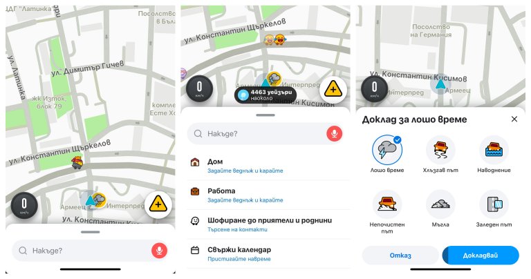Едно от най-големите предимства на Waze пред конкурентни навигации е опцията за докладване на пътната обстановка в реално време.