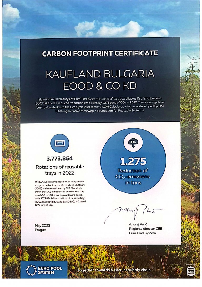 Kaufland България направи поредна стъпка за ограничаване на въздействието си върху околната среда, като спести 1 275 тона CO2 емисии през 2022 година чрез използването на рециклируеми щайги за плодове и зеленчуци за многократна употреба вместо амбалаж за еднократна употреба.