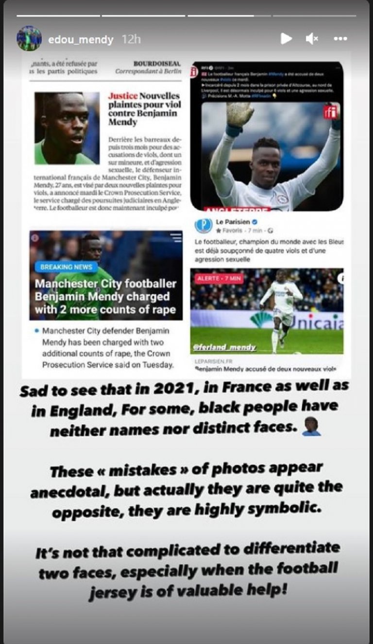 Вратарят на Челси Едуард Менди и левият бек на Реал Мадрид Ферлан Менди се оплакаха, че няколко медии са използвали техни снимки за новината, че Бенжамен Менди от Манчестър Сити е обвинен в няколко изнасилвания и сексуално посегателство.