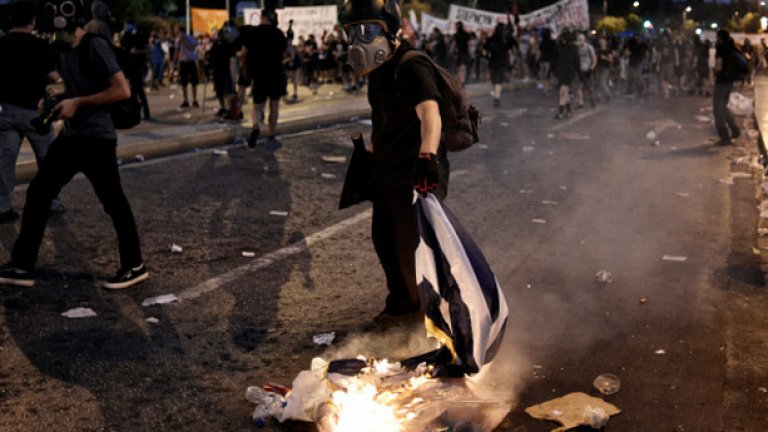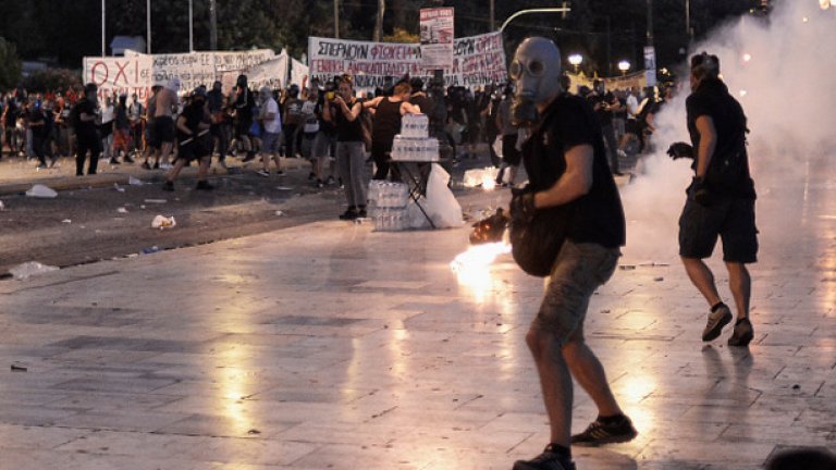 — spyros gkelis (@northaura) July 15, 2015Заради хвърлени коктейли "Молотов" униформените се принудиха да разпръснат част от агресивните протестиращи със сълзотворен газ. Една от запалителните бутилки е запратена по посока на телевизионен бус, който излъчва на живо демонстрациите.