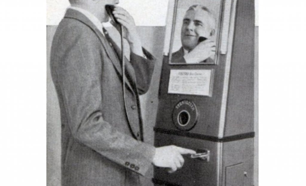 Машина за бръснене с монети от 1940 г. - идеален уред за деловия мъж с бързорастяща брада. Оказва се, че след всяко бръснене машината се самопочиства автоматично с ултравиолетово облъчване.