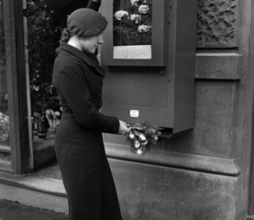 Моля, пускайте стотинките своевременно, за да не увехне стоката. На снимката: автомат за цветя в Берлин през 1935 г.