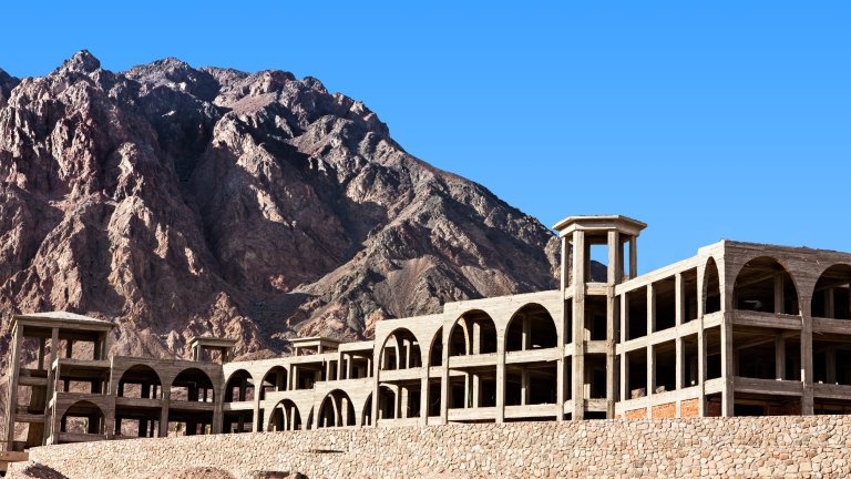 Кайро не знае какво да прави с бетонните скелети, които стърчат по синайското крайбрежие. Да се разрушат би било скъпо, да се търсят инвеститори в толкова смутен район е невъзможно. Затова постройките са изоставени да стърчат от пясъците и да напомнят за провалилия се проект.