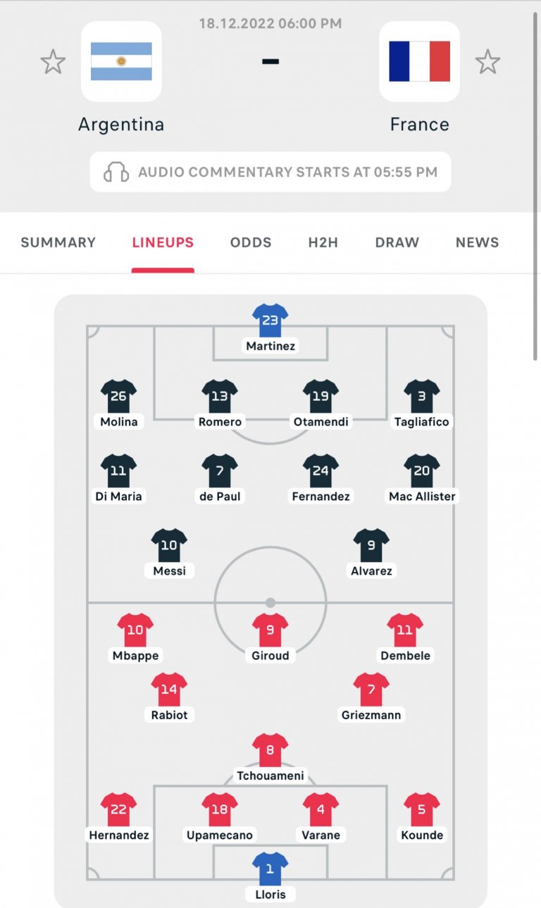 Изненади в тима на Дидие Дешан липсват, но такава има в състава на Аржентина. Лионел Скалони пуска като титуляр опитния и доста по-офанзивен Анхел ди Мария на мястото на по-дефанзивния Леандро Паредес.