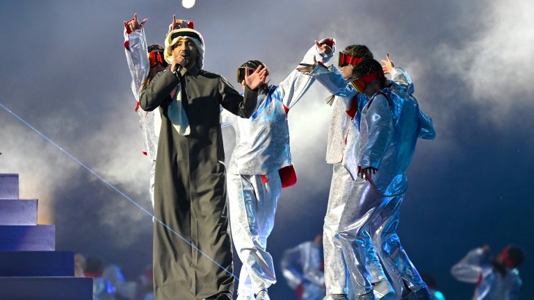 На терена се появи и талисманът на първенството - La'ebb, футболен тюрбан, който представлява арабските религии и означава "умел играч" на арабски. La'ebb бе заобиколен от всички талисмани от предишни мондиали.