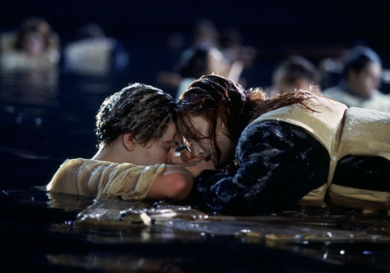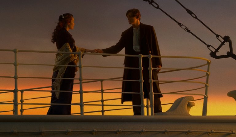 Роуз (Кейт Уинслет) се приближава към Джак (Леонардо ди Каприо), опитвайки се да му каже, че е променила мнението си и иска да бъде с него, той я хваща за ръка, двамата застават на носа на кораба, протягат ръце и Роуз казва една от най-култовите реплики в киното: "Аз летя, Джак", преди да се целунат.