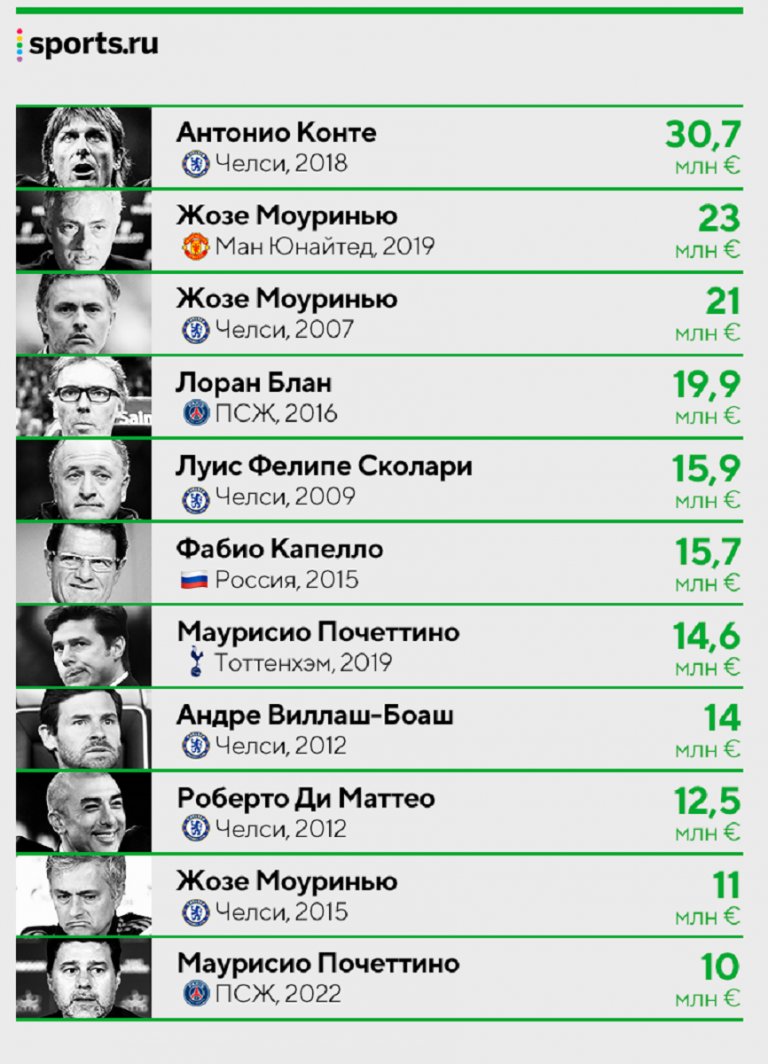 Лидер с най-солидно треньорско обезщетение е Антонио Конте, който получи над 30 млн. евро, когато бе уволнен от Челси през 2018-а. Второто и третото място се заемат от Жозе Моуриньо: (23 млн. евро от Манчестър Юнайтед, 2019 г. и 21 млн. евро от Челси, 2007 г.).