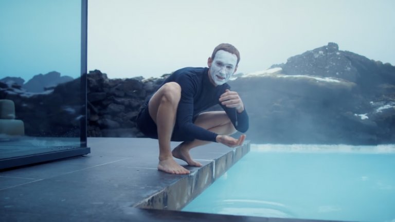 Човекът от рекламното видео на Исландия се появява в не особено осветения пейзаж навън, плътно намазан със слънцезащитен крем, отново пародирайки Зукърбърг, който се появи преди година на сърф, намазан като Жокера.