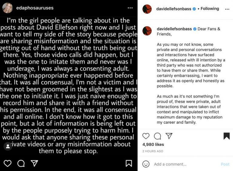 Тя също така допълва, че контактът между нея и басиста е бил "изцяло онлайн" и базиран на взаимно съгласие. Колкото до твърденията, че той я е "склонявал" към сексуални действия, тя ги определи като "дезинформация".