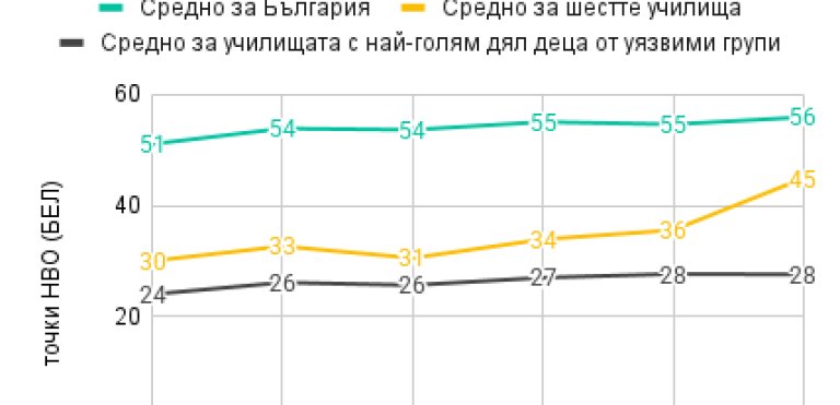 Анализът на "Заедно в час" събира резултатите от последните години показва ясна картина: средният резултат за страната на външното оценяване по български език и литература след 7. клас се задържа около 55 точки. В училищата с висока концентрация на ученици от уязвими групи той е приблизително наполовина - около 27 точки.