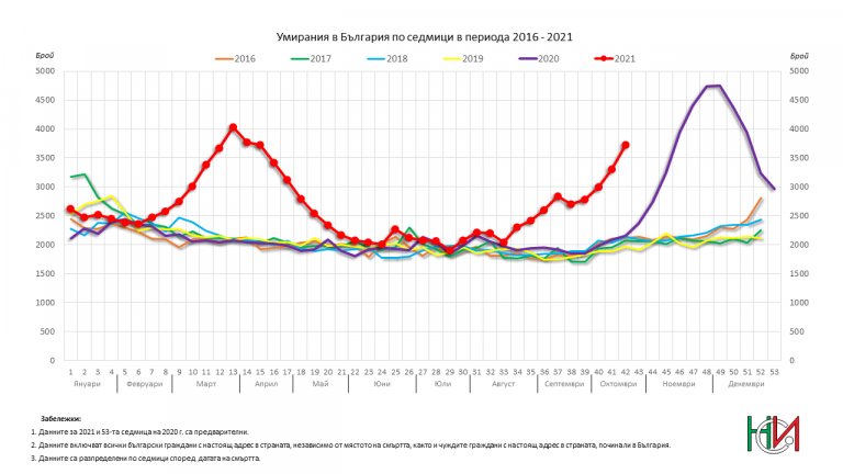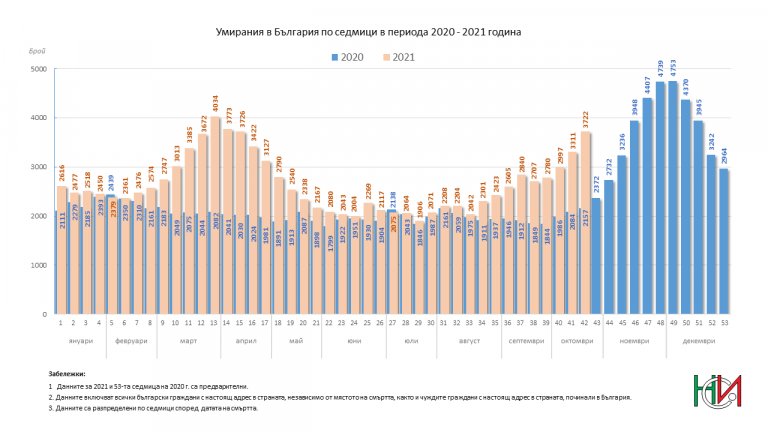 През 2020 година Националният статистически институт отчете рекордна смъртност - 15% ръст спрямо предходната година. Ако за последните 10 години у нас годишно умират 108-110 хиляди души, през 2020 година те бяха над 124 000, или с близо 17 хиляди повече спрямо 2019 г.