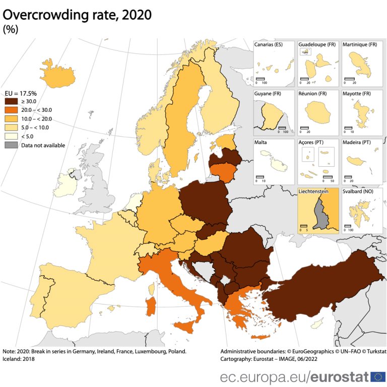 Според данните на Евростат общо 17,5 процента от европейците живеят в претъпкани жилища.