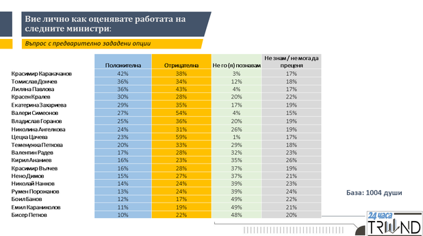 От всички членове на Министерски съвет, Бойко Борисов събира най-много положителни оценки за работата си (45%). Красимир Каракачанов, Томислав Дончев и Лиляна Павлова са министрите, които получават най-висока оценка за работата си.