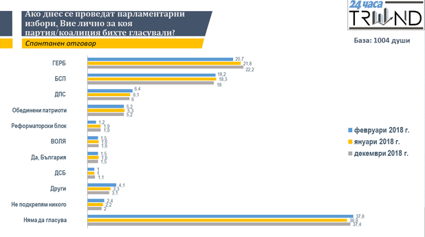 Това показва февруарското проучване на обществените нагласи проведено от Изследователски център "Тренд", по поръчка на в. "24 часа". Изследването е представително за пълнолетното население на страната и е проведено сред 1004 пълнолетни български граждани по метода "лице в лице". Теренът на проучването е осъществен между 1 и 8 февруари 2018 г.