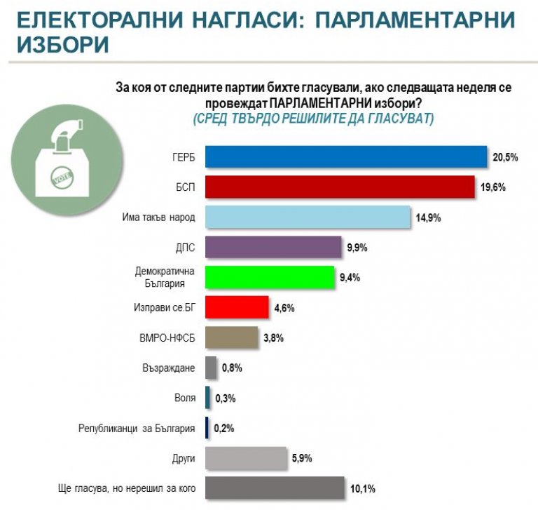 Според данните от проучването сред твърдо решилите да гласуват, ГЕРБ и БСП сближават позиции, като ГЕРБ продължава да води с 0,9% пред левицата (20,5% срещу 19,6%).