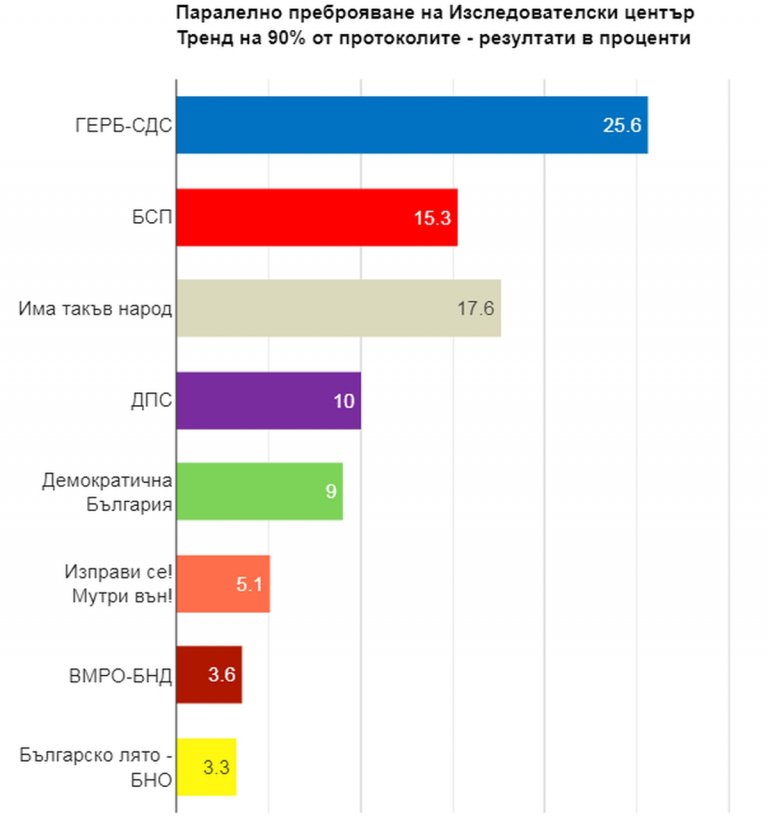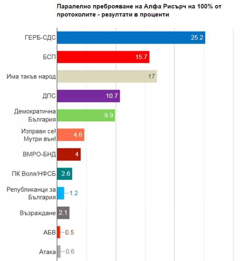 Според паралелното преброяване на "Алфа рисърч", направено на 100%, коалицията на ГЕРБ и СДС води с 25,2%. ИТН се нарежда на второ място със 17,1%, а челната тройка се завършва от БСП с 15,7% от гласовете.