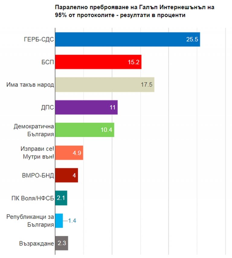 При 95% обработени протоколи от паралелното преброяване данните на "Галъп интернешънъл" запазват тази подредба, но с леки разлики в процентите.