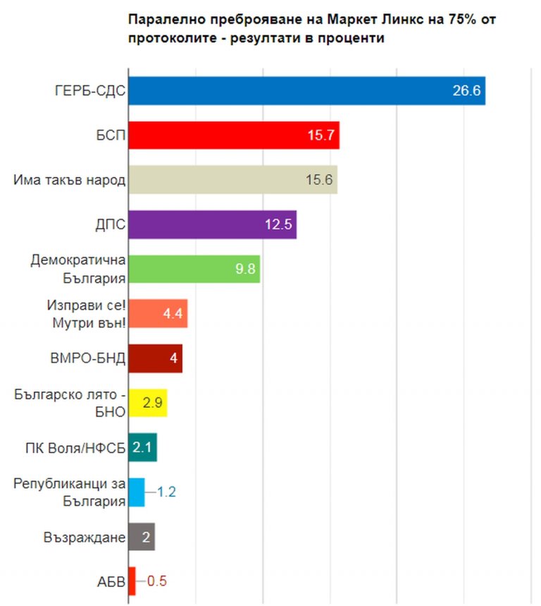 Подобни са данните и от 75% паралелно преброяване на "Маркет линкс" и 90% паралелно преброяване от "Тренд", като разликата при Изследователския център е, че при тях ВМРО остава под чертата за влизане в следващото Народно събрание.