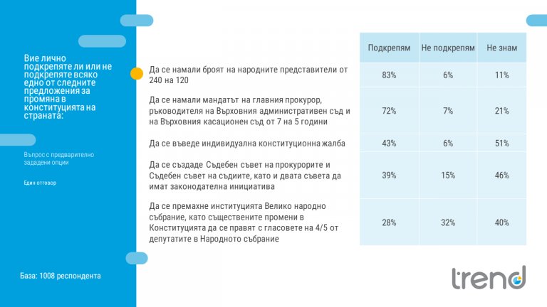 Премахването на институцията Велико народно събрание пък е единствената промяна, за която по-голямата част са против (32%) срещу подкрепа за нея от 28%. Най-голям дял обаче не познават тази материя или не могат да преценят кое е по-доброто решение. Близо половината (46%) пък не вземат отношение и към създаването на съдебен и прокурорски съвет, които да имат законодателна инициатива.