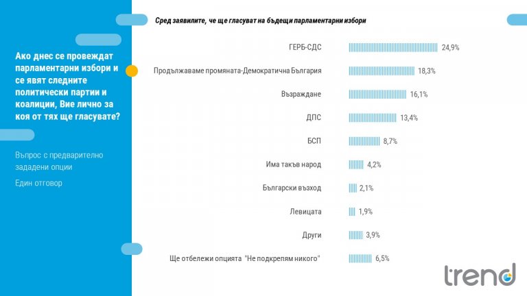 Резултатите показват, че ГЕРБ-СДС продължават да са партията с най-висока подкрепа. 24,9% от анкетираните казват, че ще гласуват за тях при нови избори.