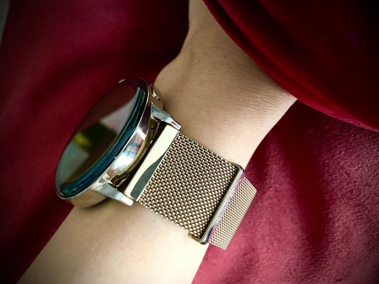 Да, гъвкавата каишка с металически блясък обвива перфектно китката и след кратко носене не се усеща изобщо. Отдалеч умният часовник прилича по-скоро на моден аксесоар, отколкото на високотехнологично устройство с огромна поредица от функции.