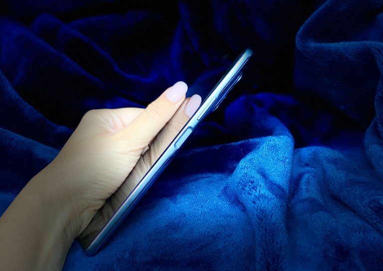 Телефонът в ръцете ми е с лъскав син гръб, в който цветовете се преливат в зависимост от светлината с мек хамелеонов ефект. Официалното название на цвета е "Кристално синьо", но идва и в "Перлено бяло" и "Среднощно черно".