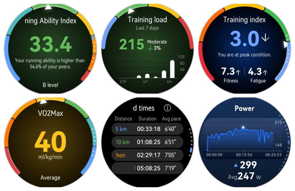 HUAWEI WATCH GT Runner 2 предоставя и още цял куп полезна информация, независимо дали се тренира в маратонски или друг режим. Въведен е Running Ability Index, който сумира данните за пулс и темпо от всички бягания, за да оцени текущото ниво и да представи прогнозни времена за различни дистанции.