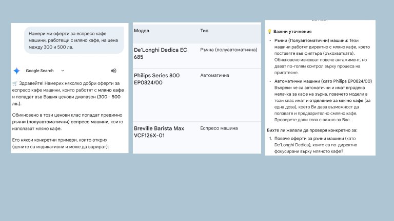 AI асистентът на Google е интегриран със смартфона на Honor и се активира с натискане и задържане на power бутона. Отвори се един плаващ прозорец, където поисках информация за кафе машини на стойност между 300 и 500 лв., работещи с мляно кафе. Предпочитам го пред капсулите.