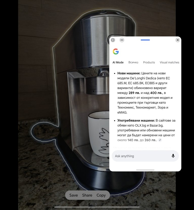 Тя има много приложения, но в случая ми бе важно работата ѝ с изображения. Снимах кафе машината, влязох в галерията и тук изкуственият интелект ми позволи да маркирам обекта на снимката и да го драгна надясно, където ми се отвори поле с приложения.