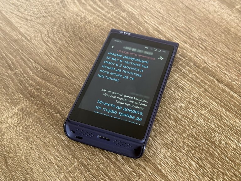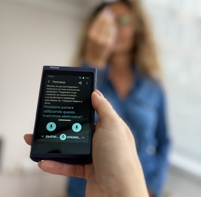 Функцията работи така: звъня на номер в Германия и обяснявам, че съм резервирала къща. Vasco превежда с глас моите думи от български на немски на човека отсреща, а аз първо чувам немския говор и няколко секунди по-късно виждам изписания превод на български на екрана.