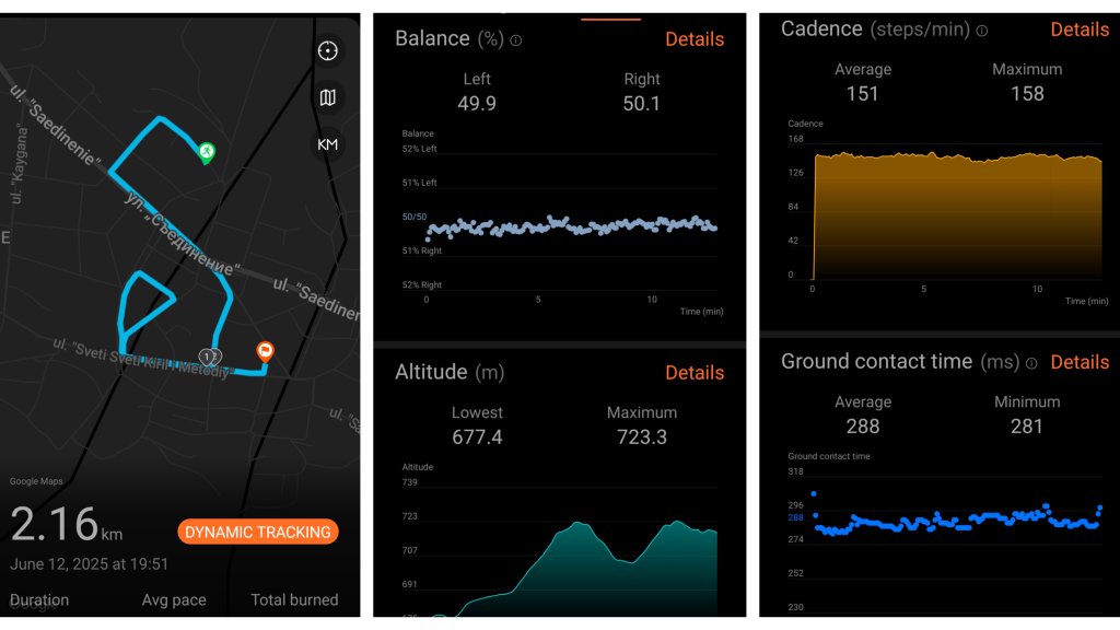 - Huawei Watch Fit 4 Pro събира данни и представя подробен анализ на тренировката, включително пулс, скорост в различните етапи, ритъм, баланс между ляв и десен крак и даже надморската височина, тъй като часовникът от тази година вече разполага с барометър.