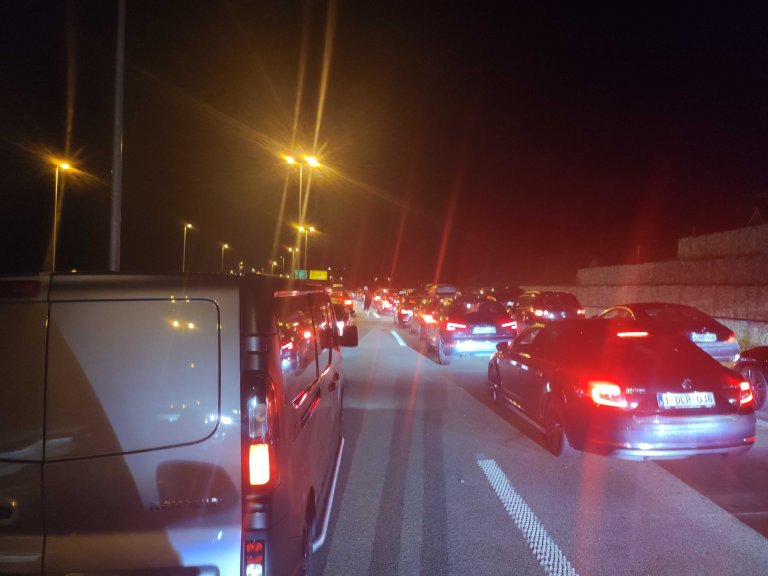 Така например около нас пътуваха поне 4 коли с нидерландски номера (да, отново), чиито шофьори си комуникираха с уоки-токита. Правеха и тарикатски маневри - един се вмъкна в привидно по-бързата колона, за да я запуши и да позволи на другарите си да се вмъкнат преди него. Не сработи. Както, надявам се, не е сработило и мизерната проява на няколко шофьори да изпреварят колоните в аварийната лента.