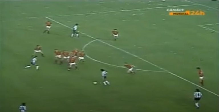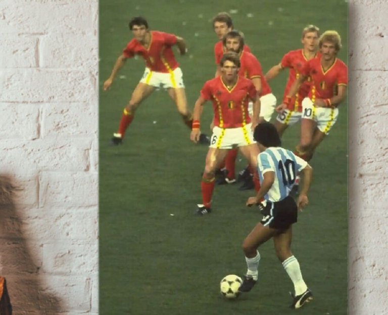 13 юни 1982 година. Откриващият мач на Световното първенство в Испания. Препълнен "Камп Ноу". Това е първият двубой на Диего Марадона с националната фланелка на Аржентина на голям форум. И Дон Диего веднага се превръща в герой за сънародниците си, "развъртайки" целия отбор на Белгия. Съперникът е толкова уплашен от него, че изпраща всичките си футболисти срещу младия аржентинец. Или поне това се вижда на тази снимка. Но истината е малко по-различна...